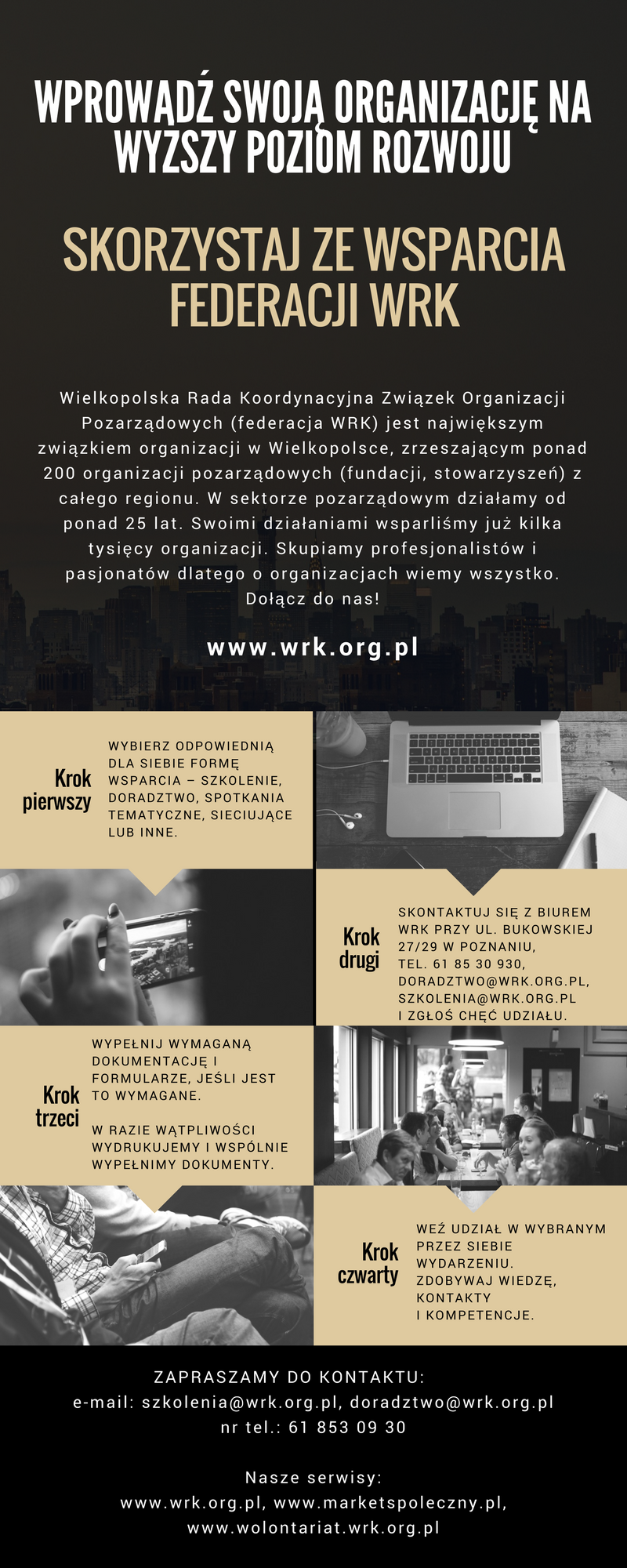 Wielkopolska Rada Koordynacyjna Związek Organizacji Pozarządowych (federacja WRK) jest największym związkiem organizacji w Wielkopolsce, zrzeszającym ponad 200 organizacji pozarządowych i innych podmiotów społecznych (fundacji, stowarzyszeń, spółdzielni socjalnych) z całego regionu. W sektorze pozarządowym działamy od ponad 25 lat. Swoimi działaniami wsparliśmy już kilka tysięcy organizacji. Skupiamy profesjonalistów i pasjonatów dlatego o organizacjach wiemy wszystko.