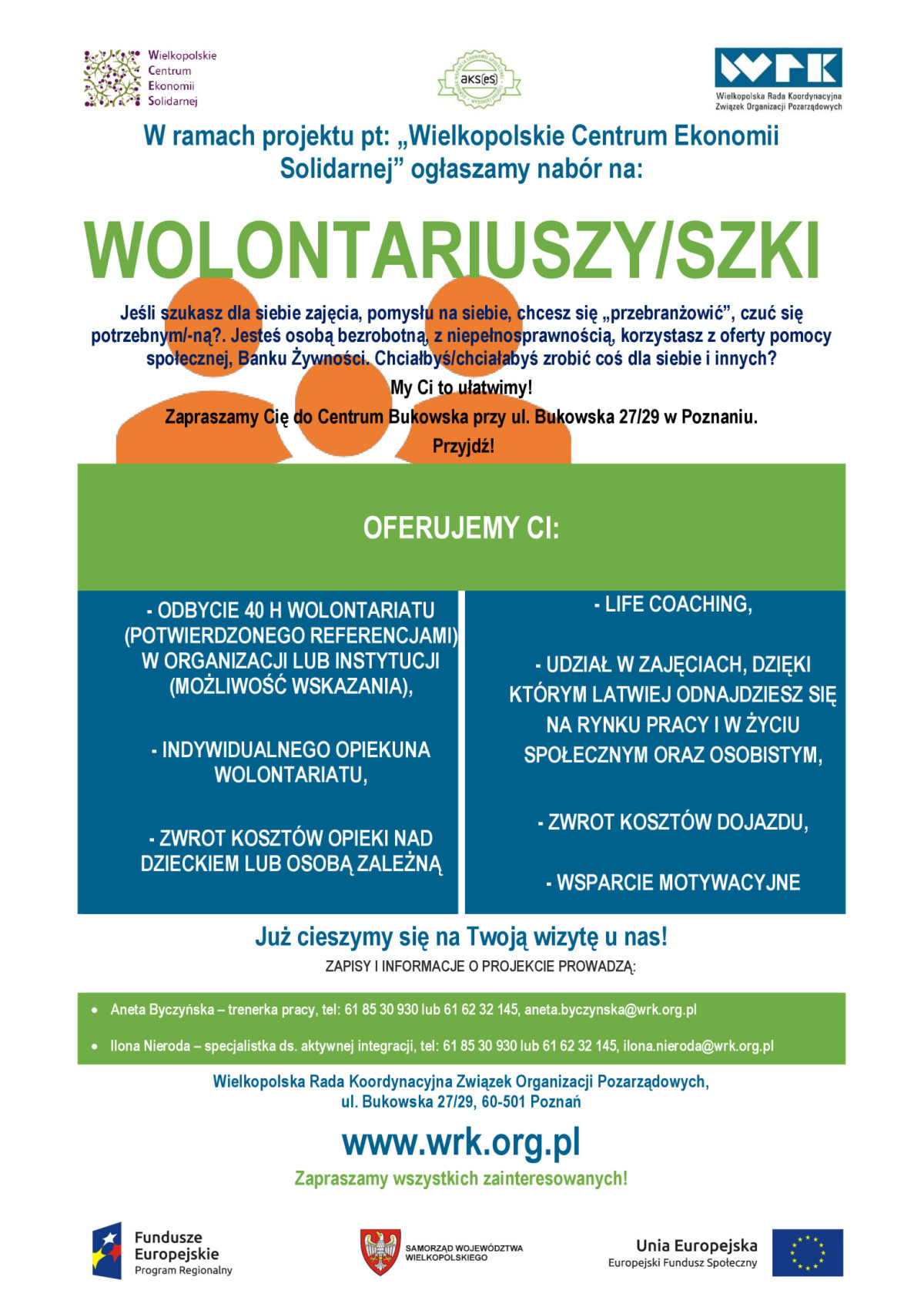 Wielkopolska Rada Koordynacyjna Związek Organizacji Pozarządowych w ramach projektu “Wielkopolskie Centrum Ekonomii Solidarnej” poszukuje osoby z subregionu poznańskiego (tj.z powiatów: obornickiego, szamotulskiego, śremskiego, średzkiego, poznańskiego oraz Poznania) do ODBYCIA WOLONTARIATU (w całkowitym wymiarze 40 godzin).Wolontariat adresowany do: